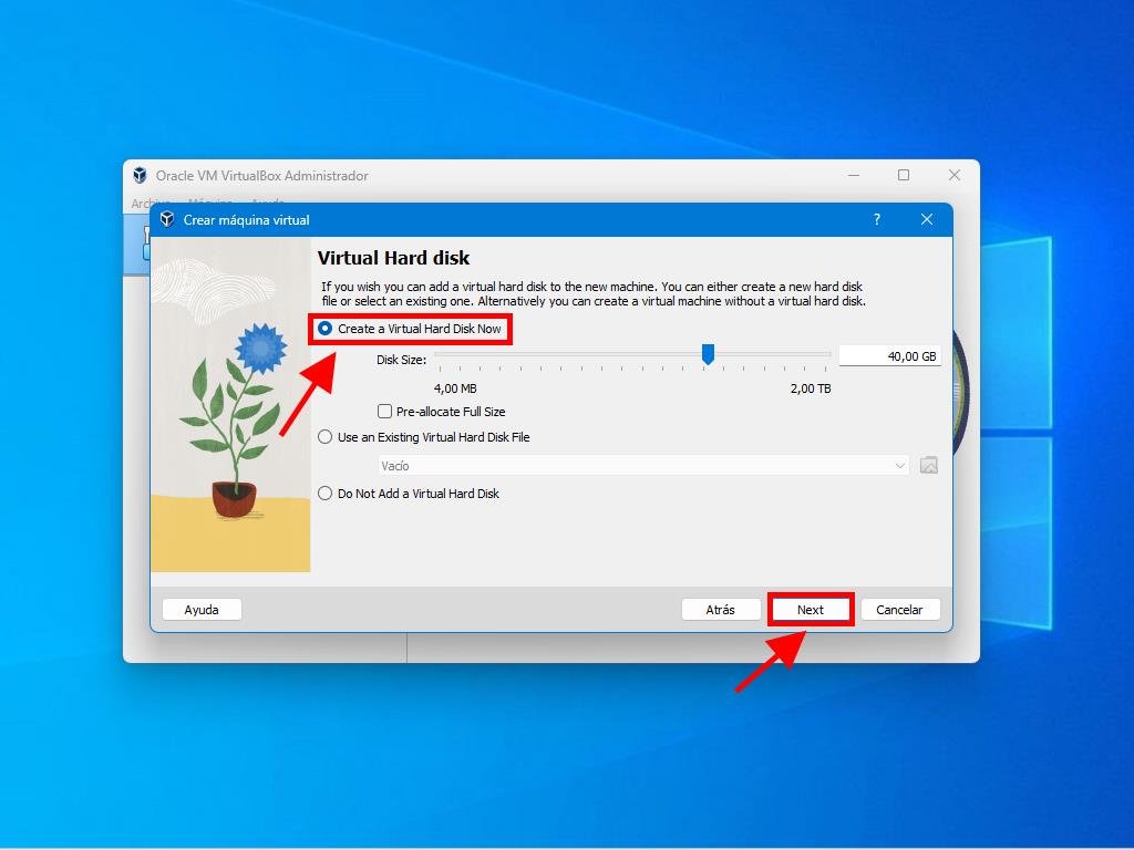 - Haz clic en la opción Create a Virtual Hard Disk Now (debes usar un mínimo de 40 GB para el correcto funcionamiento). Luego haz clic en Next.