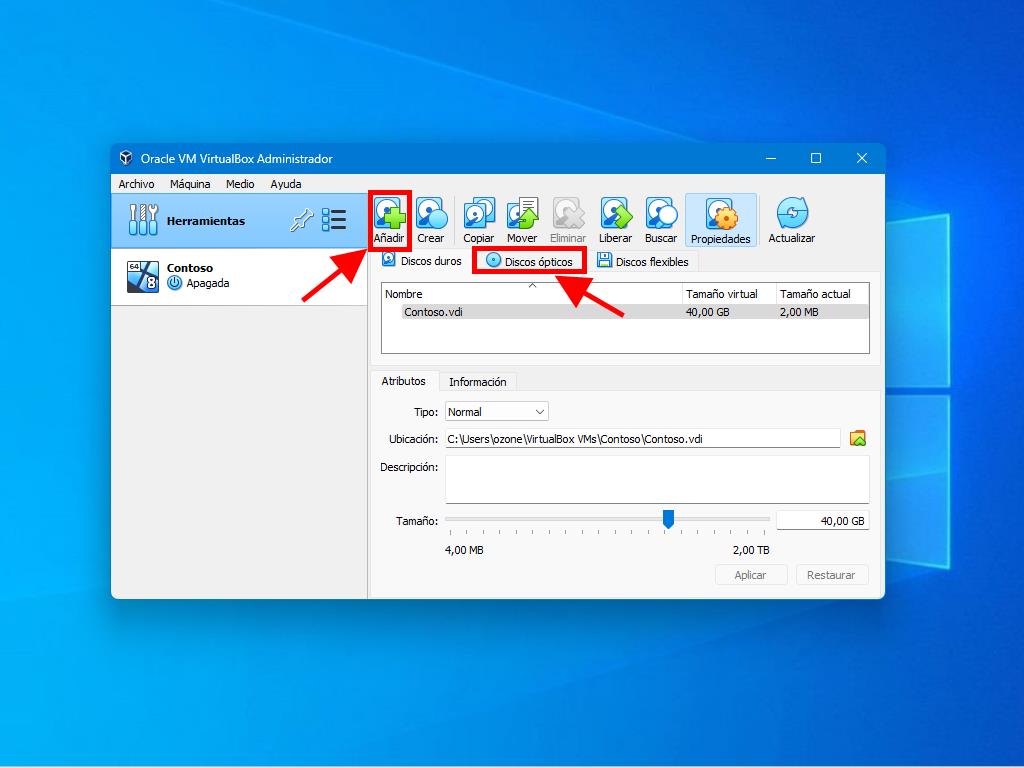 - Luego selecciona la pestaña Discos ópticos y haz clic en Añadir. Selecciona el archivo .iso de Windows 8.