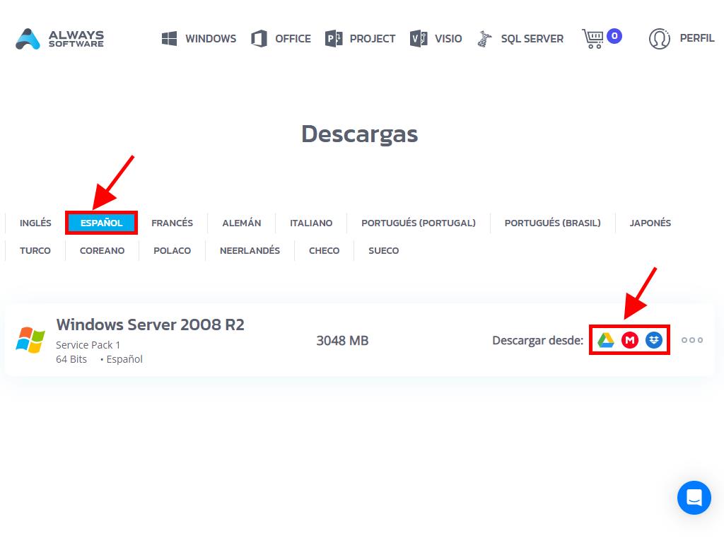 En la sección Descargas, selecciona el idioma y el servidor de descarga que esté disponible y que más te convenga (Microsoft / Google Drive / Mega / MediaFire / Dropbox).