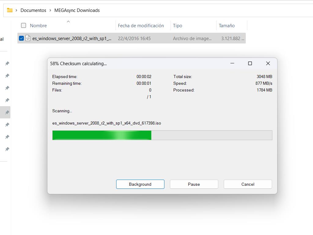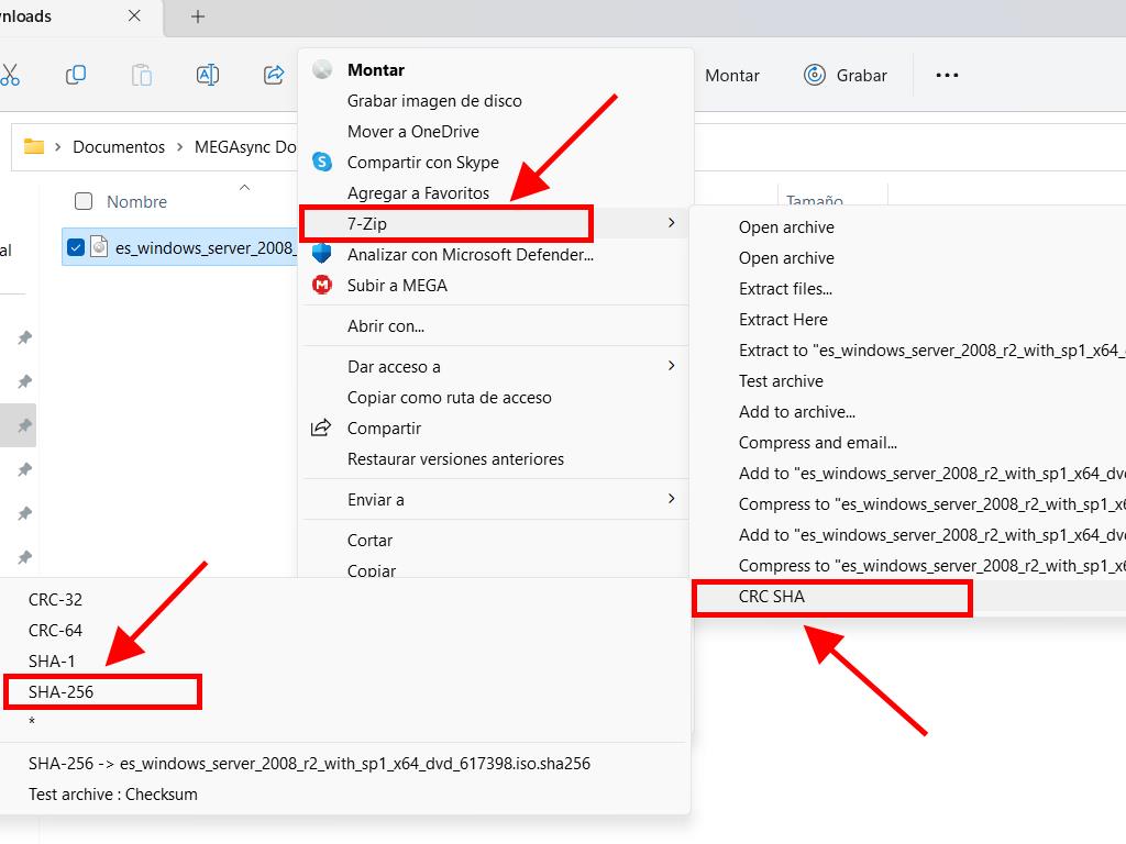 - Busca el archivo .iso de Windows Server 2008 R2 que ya has descargado. Haz clic derecho sobre él y luego selecciona 7-Zip > CRC-SHA > SHA-256.