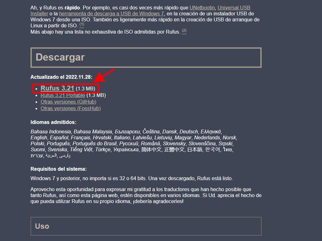 - Desplázate hacia abajo y descarga la versión de Rufus más actualizada en la sección Descargar.