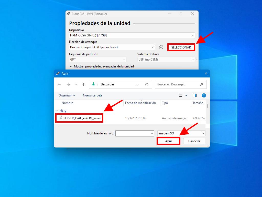 - Haz clic en Seleccionar y busca el archivo .iso de Windows Server 2022 que deseas configurar.