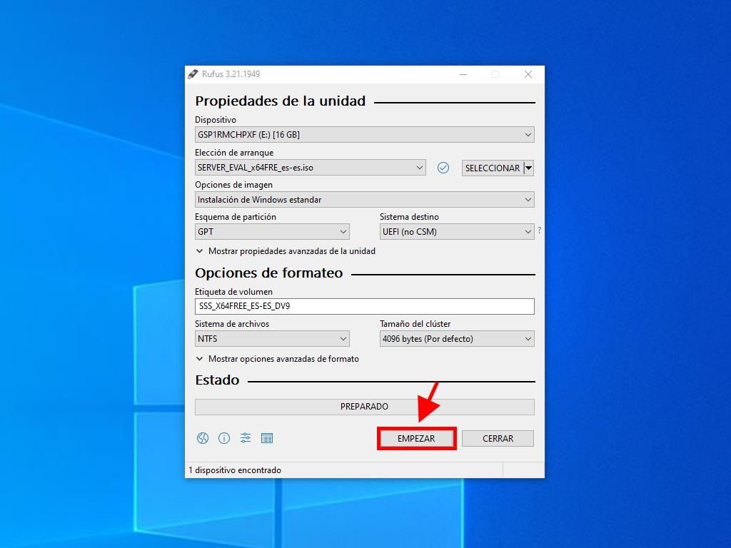 - Por último, haz clic en Empezar y espera a que el programa cree la unidad USB de arranque.