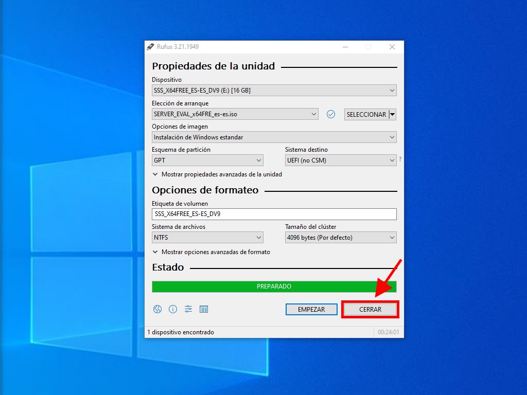 - Una vez finalizada la configuración (barra de progreso Preparado), haz clic en Cerrar y estará listo para instalar Windows Server 2022.