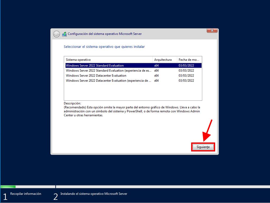 - Luego, selecciona la edición de Server que deseas instalar y haz clic en Siguiente.