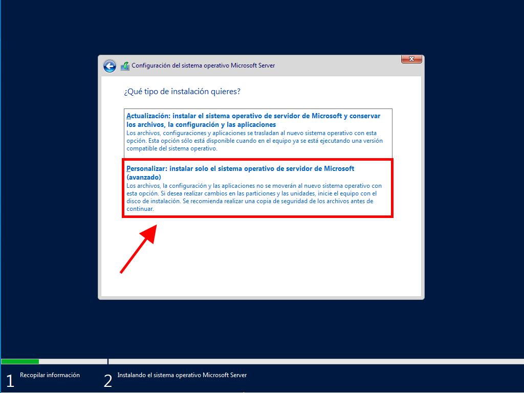- En el siguiente paso, haz clic en Personalizar: instalar solo el sistema operativo de servidor de Microsoft (avanzado).