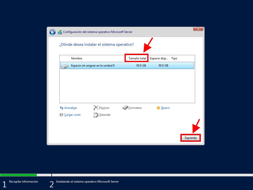 - En el siguiente recuadro, selecciona la unidad de disco donde deseas instalar Windows Server y haz clic en Siguiente.