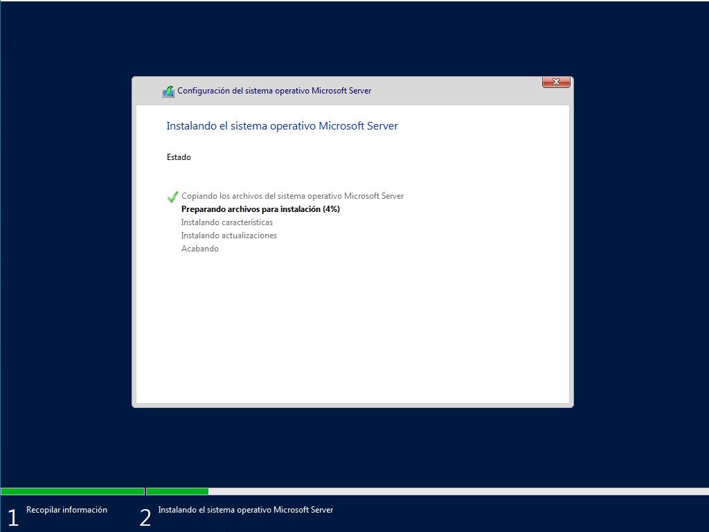 - Empezará la instalación de Windows Server. Tomará unos minutos.
